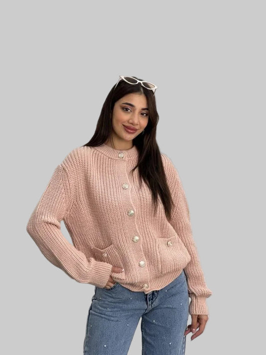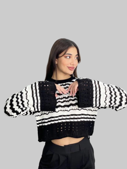 Randig öppenstickad långärmad kort tröja för kvinnor