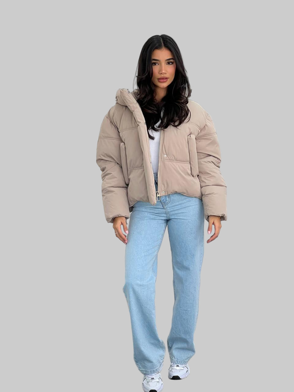 Jackan har en beskuren längd och en hög ståkrage. Den har en dragkedja framtill som sträcker sig från fållen till kragens topp. Ärmarna är långa och lätt puffiga, med elastiska muddar vid handlederna. Horisontella sömmar delar upp ytterytan i jämnt fördelade vadderade sektioner. Två sidofickor är placerade i höfthöjd med dolda öppningar. Fållen sitter ovanför höfterna och har små justerbara flikar på varje sida.